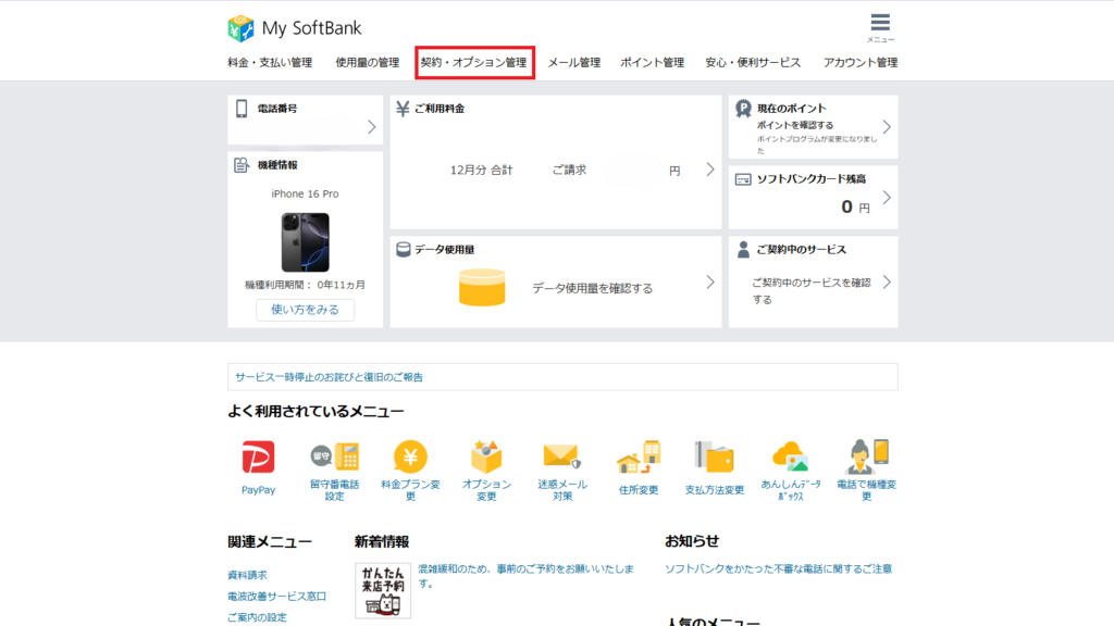 「契約・オプション管理」→「オプション」の順番にクリック(タップ)。